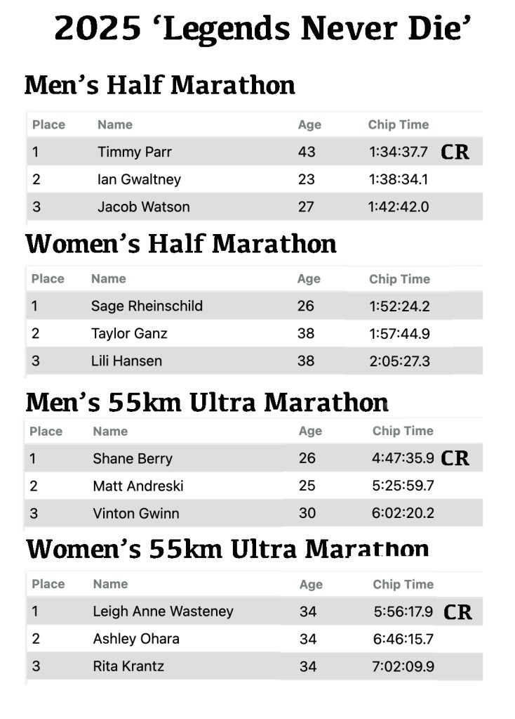| Women’s Ultra Marathon (2025) | Leigh Anne Wasteney | 5:56:17 |
